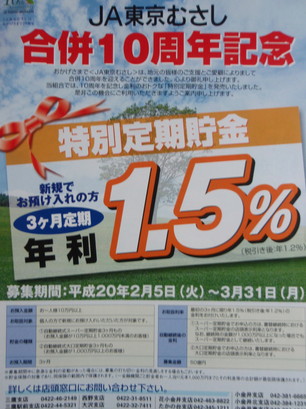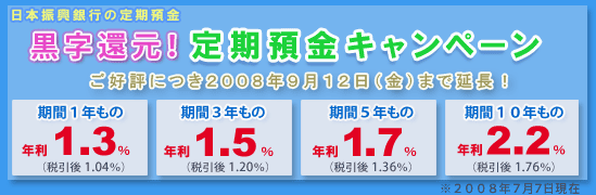 いま、円高、株安、サブプライムローン問題といった先行き不透明な時にしばらく様子を見ようと思っている方達は、高金利の円預金にしておくのが一番だ。たとえ3ヶ月であろうとも、年利1.5%の金利をつけるのはどう考えてもサービスである。何しろ10年ものの基準金利が1.3%くらいだからだ。それもこうした特別優遇金利の最低預入金額は300万円といったような金額であることが多いのだが、10万円以上ということでハードルも低い。もちろん、500万、1000万円と余剰資金があるのならなおさらだ。たった3ヶ月であったとしても、1000万円を預け入れれば、3ヶ月でほぼ受取利金は税引後で3万円だ。通常の定期預金より2万円くらい高額なのではないか?そして、この定期預金をすることで、3ヶ月で7500円が税金として国庫の収入にもなる。君は面倒かもしれないが、それは自分も潤い、国家にも貢献できることと分かって欲しい。